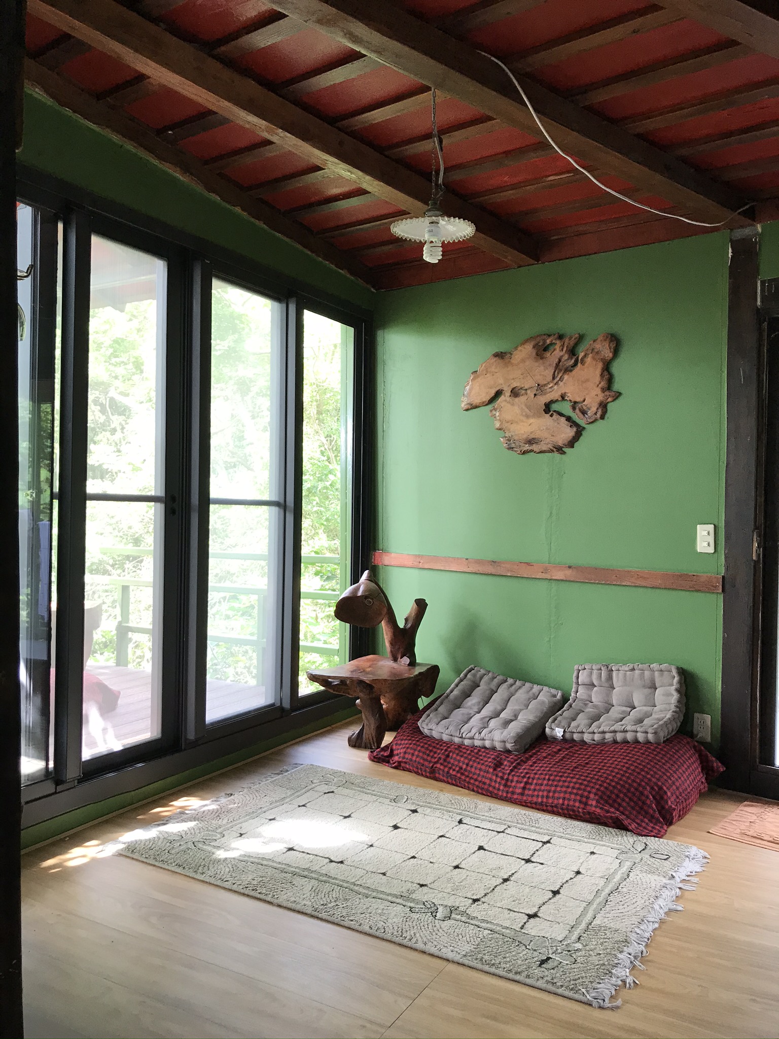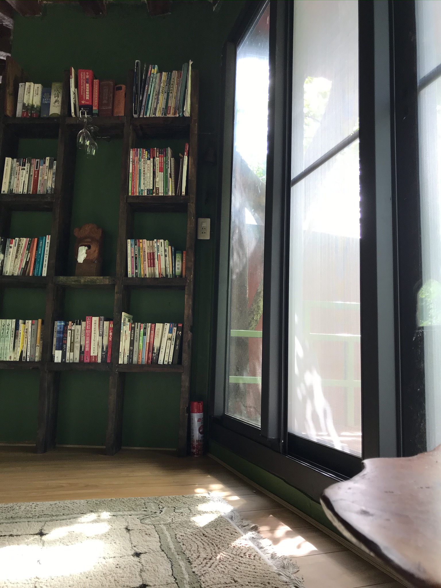 一樓的原木傢俱、沈靜的綠皮沙發、復古的橘色地磚…在明麗的陽光下顯得溫馨又愜意
