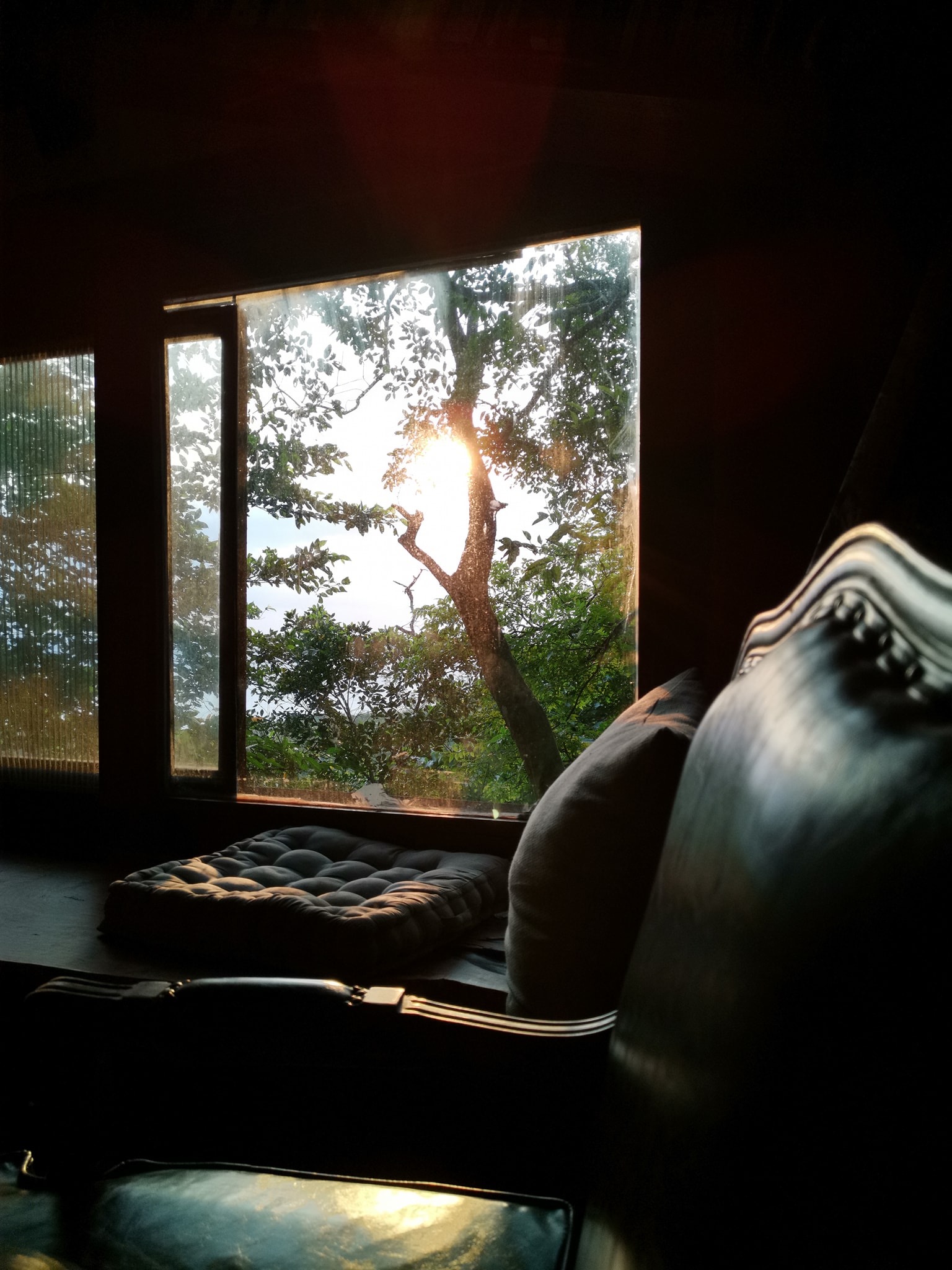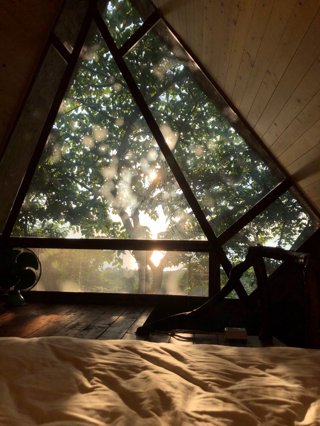 只見一片溫暖木色中靜躺著一張潔白的床,猶如被溫厚手掌輕捧住的羽毛..順著陽光回頭,溫暖的光束穿透一面切割如鑽石的窗子,撒下一片耀眼的青翠
