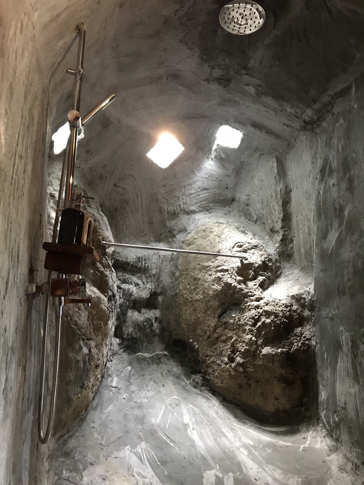 石頭爸便趁著改建的機會增加了一個室內的淋浴間!但依舊不想跟大自然拉開太多距離,是以保留了原始的大石&開了小小的玻璃磚天窗